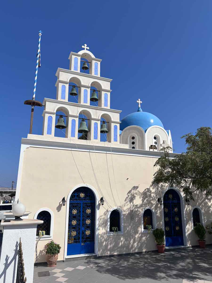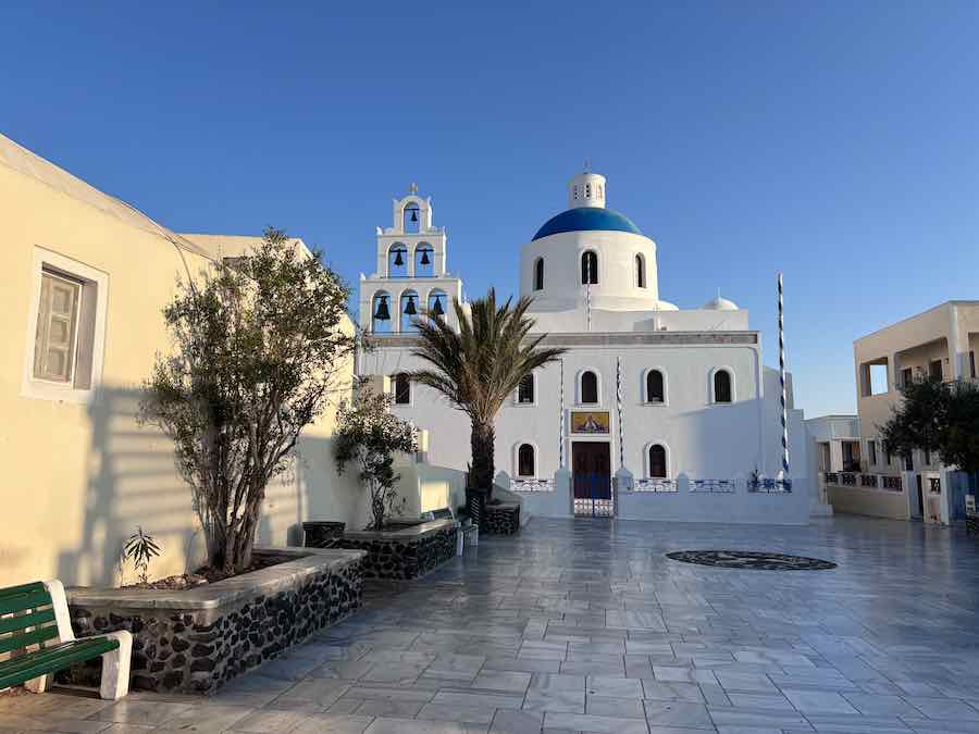 Mich zog es stattdessen zur Cathedral of Saint John the Baptist. Abseits der überfüllten Hauptwege herrscht hier eine ruhige Atmosphäre. Man kann die Architektur in Ruhe bewundern, ein paar Momente der Stille genießen und einfach die Schönheit Santorins auf sich wirken lassen – eine Wohltat für Familien, die zwischendurch mal dem Trubel entkommen möchten.