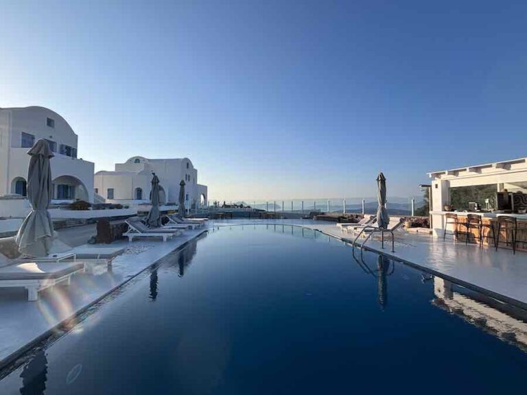 Wir entschieden uns gegen einen erneuten Besuch am Roten Strand oder eine Besichtigung der Ausgrabungsstätte Akrotiri. Stattdessen verbrachten wir den Vormittag gemütlich am Pool des Kalestesia Suites Hotels. Für den Mittag hatte das Hotel kleine Clubsandwiches serviert, die wir direkt am Pool genießen konnten – praktisch, lecker und entspannt, besonders für Familien mit Kindern, die zwischendurch Energie brauchen.