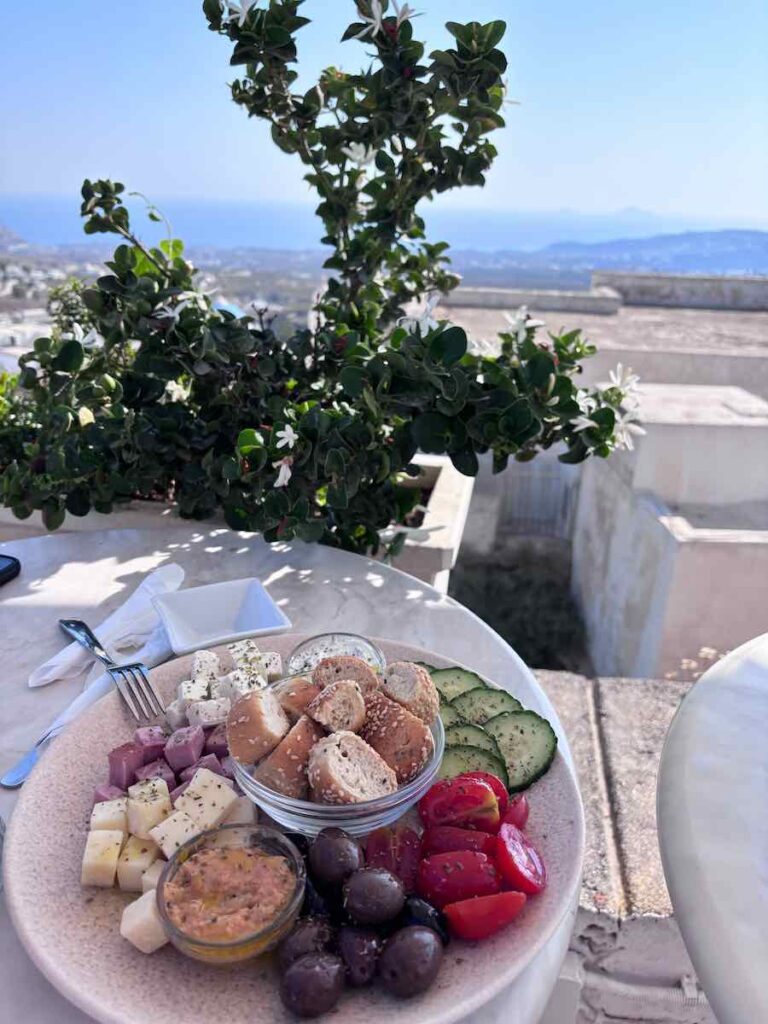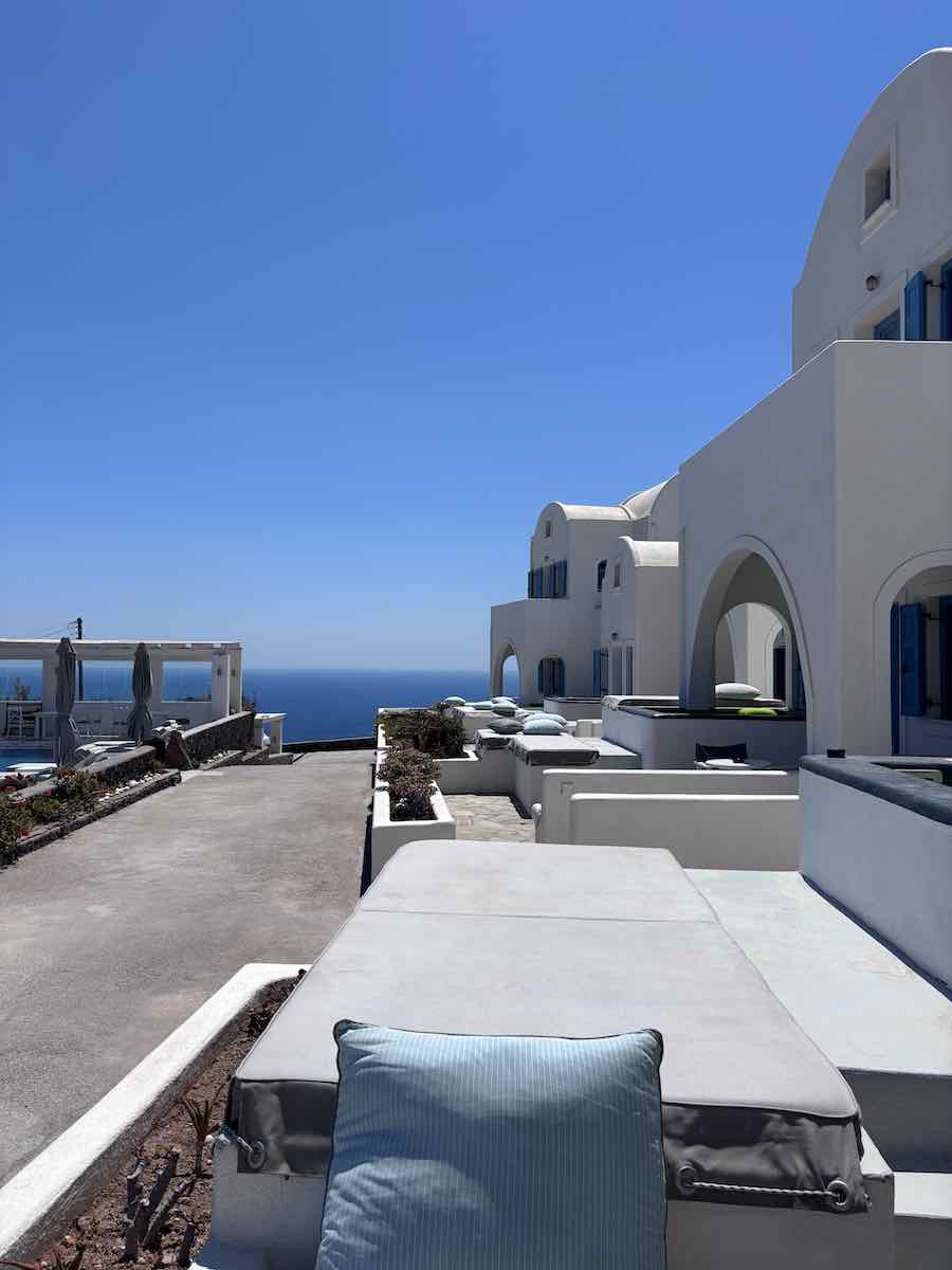 Da unser Zimmer um 11 Uhr noch nicht fertig war, folgten wir dem Tipp der freundlichen Rezeptionistin Irini und frühstückten in der KooKoo Bar – sehr empfehlenswert, vor allem der Avocado-Toast. Kurz darauf konnten wir unsere Courtyard Suite Split Level Sea View beziehen. Highlight: direkter Zugang zum Pool, plus Dachterrasse mit Blick über Oia – perfekt für ein Glas Atlantis Rosé am Abend.