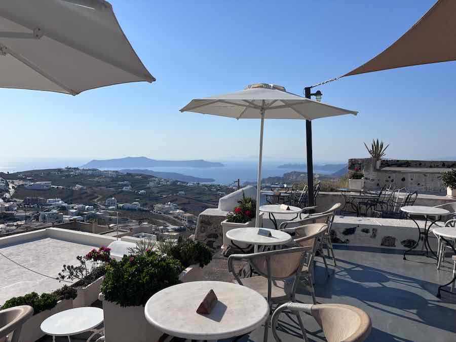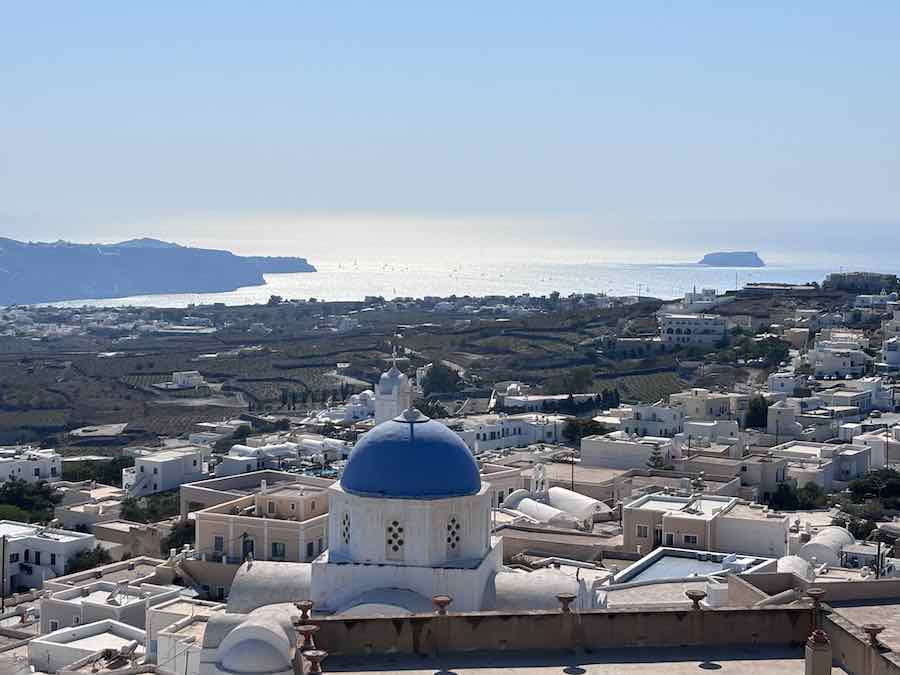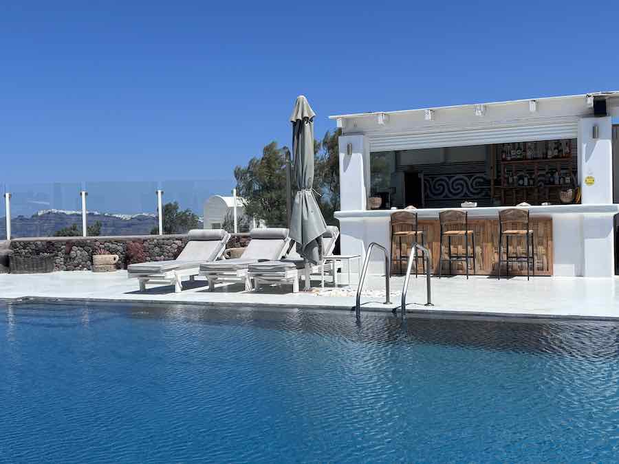 Den zweiten Aussichtspunkt nördlich der Kirche habe ich mir gespart – dort war es schon voller – und stattdessen den Rückweg über die Passaris Bakery gemacht. Die Auswahl an frischen griechischen Spezialitäten, begleitet von einem kräftigen Kaffee, war ein perfekter Start in den Tag. Mit der Tüte voller Köstlichkeiten ging es zurück ins Hotel, wo wir unser Frühstück entspannt auf der Dachterrasse genießen konnten. Während unten die ersten Touristenbusse eintrafen, hatten wir in unserer kleinen Oase noch Ruhe – und anschließend den Pool fast für uns allein.