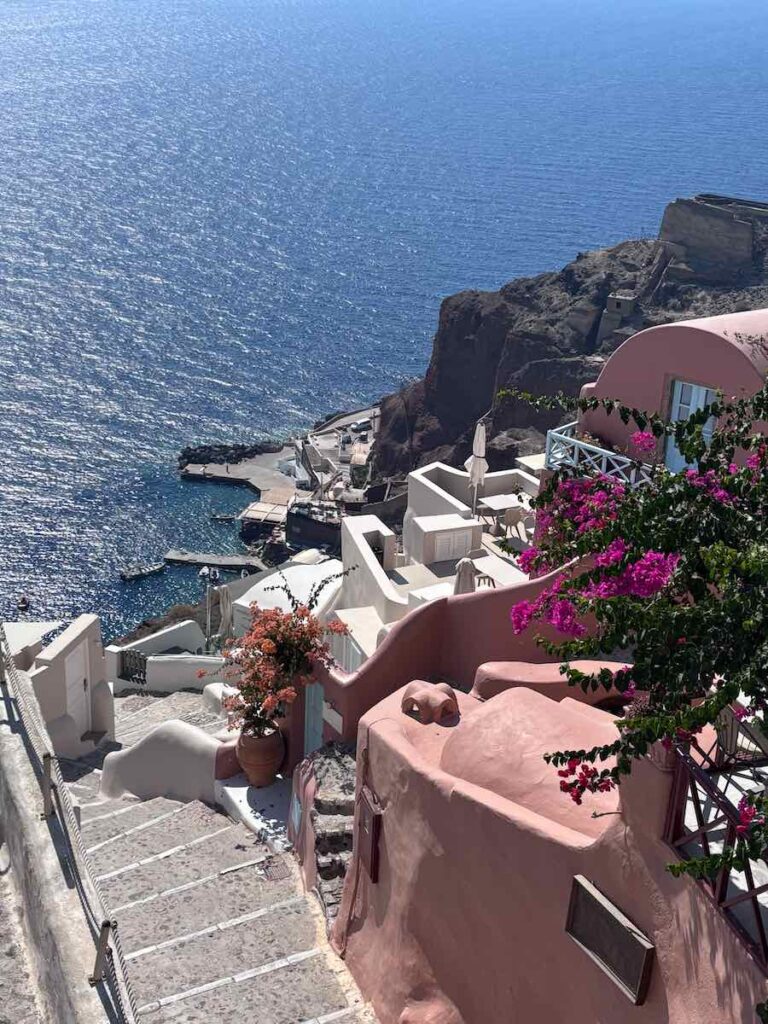 Gerade deshalb waren wir froh über unsere Unterkunft etwas abseits. Die kleine Anlage mit Pool war für uns wie ein Rückzugsort. Der Blick von oben auf die Touristenströme erinnerte uns daran, dass wir bewusst die richtige Wahl getroffen hatten. Direkt an der Caldera wäre der Ausblick zwar atemberaubend gewesen, aber die Kehrseite sind die Massen, die schlimmstenfalls direkt vor der eigenen Terrasse vorbeiziehen. Hier muss jeder seine Prioritäten kennen – für uns war Ruhe wichtiger als die berühmte Aussicht.