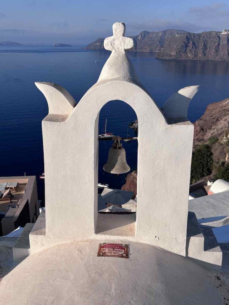 Südlich der Kirche angekommen, zeigte sich Oia im warmen Morgenlicht von seiner vielleicht schönsten Seite. Noch war es ruhig, nur vereinzelt standen Instagram-Begeisterte an den bekannten Spots. Dennoch konnte auch hier die Geduld strapaziert werden – nicht, weil die Schlange so lang gewesen wäre, sondern weil manche Gäste scheinbar endlos an der perfekten Pose feilten. Für uns war es trotzdem der ideale Zeitpunkt, um den Moment einzufangen, bevor die Gassen wieder von Reisegruppen überrollt werden.