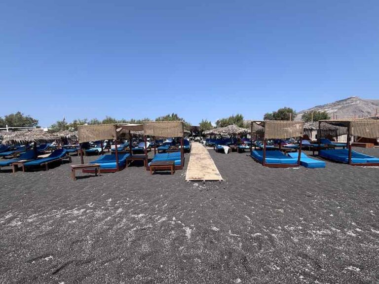Nach den ersten Tagen voller Besichtigungen und kleinerer Abenteuer stand heute ein entspannter Strandtag auf dem Programm. Um nicht nur am Pool des Hotels zu bleiben, machten wir uns früh auf den Weg Richtung Perissa, bekannt für seinen schwarzen feinen Lavastrand – ein echtes Highlight für Kinder, die gerne Sandburgen bauen oder im flachen Wasser planschen.